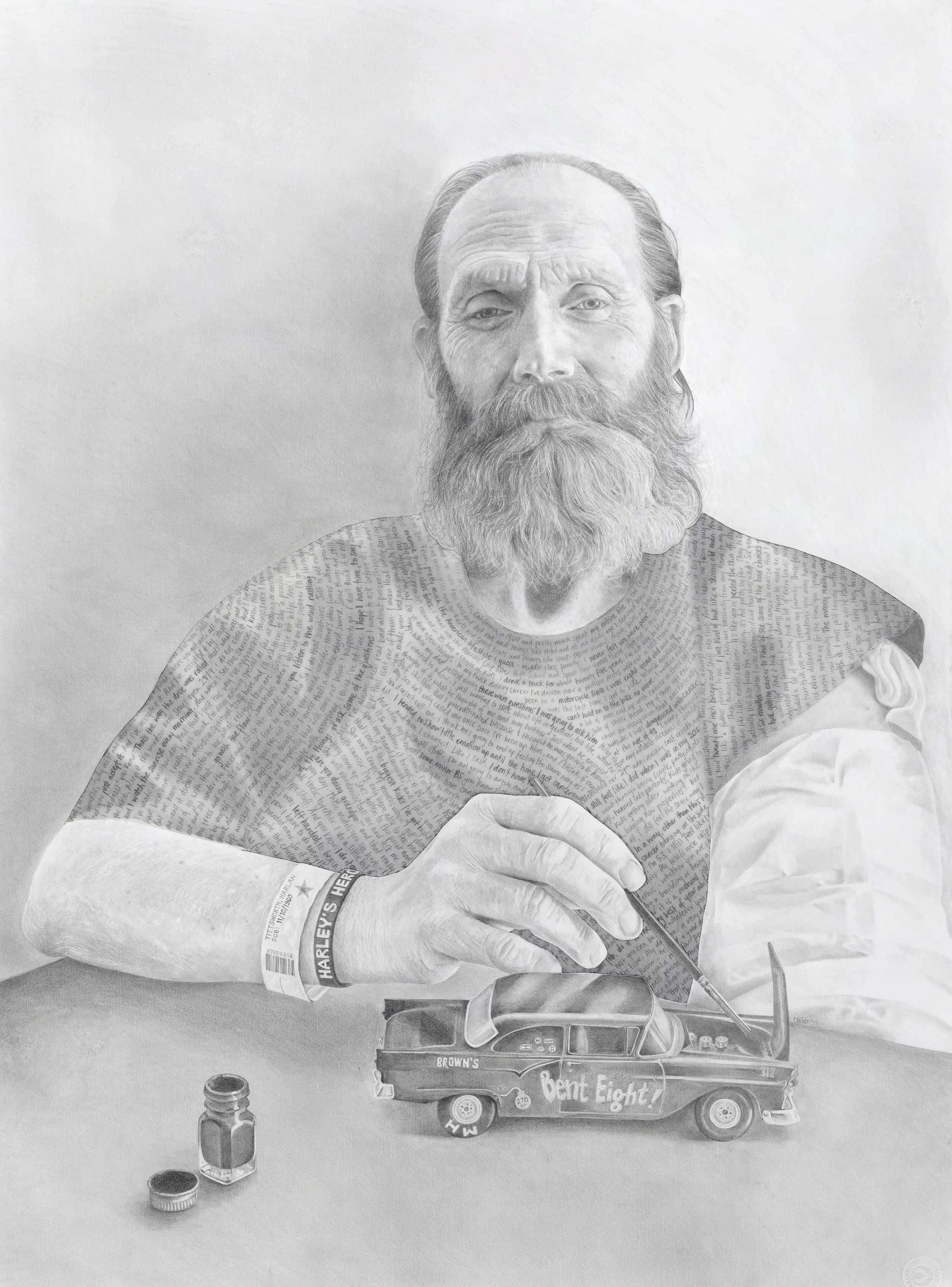 When I met Harlan, he had been a resident at the VA Medical Center in Livermore for more than three years. Harlan grew up on a farm in Central California where he learned to hot-rod cars and fix up motorcycles. The tumors consuming his left arm were thought to be the consequence of decades of driving a truck in the California sun. No longer able to drive fast cars, Harlan taught himself to build and paint model vehicles with his non-writing hand. As the boundaries of his world closed in on him, Harlan continually found new ways to create meaning in his life. Once a self-proclaimed unemotional man, Harlan opened up his life to me and shared his deepest regrets and fears. Harlan died on November 2, 2014.